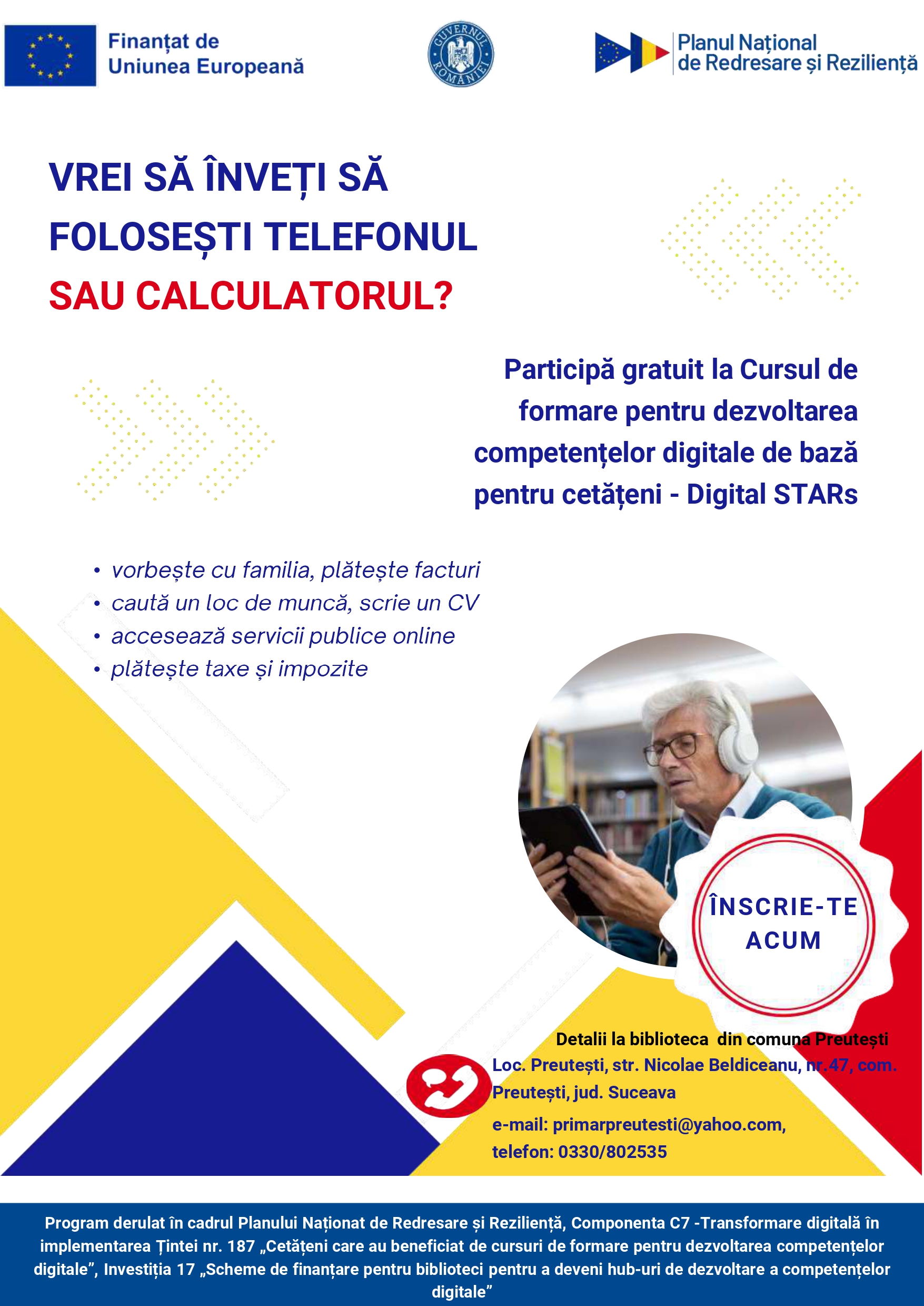 Comuna Preutești anunță organizarea începând din această lună de cursuri gratuite de competențe digitale pentru cetățeni – Digital Stars, în cadrul proiectului „Biblioteca – Hub digital pentru educație”.